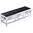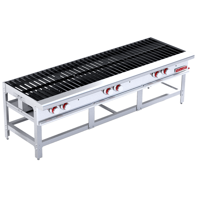 Estufón triple 3 quemadores de hierro fundido de 70,000 BTU/h c/u. 6 Parrillas superiores en hierro fundido. 3 pilotos individuales, válvula de de ajuste de flama piloto, charola de captación de escurrimientos. Incluye kit de espreas para convertir de gas GLP a GN.