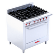 Parrilla de 6 quemadores octagonales en hierro fundido de 24,000 BTU/hr cada uno. Tres parrillas superiores en hierro fundido, 6 pilotos individuales, 3 válvulas doble de ajuste flama, 6 válvulas de gas importadas. 1 Charola de captación de escurrimientos. Incluye kit de espreas de conversión de gas GLP a GN. Horno grande con medida 0.66x0.59x0.42 M, 2 parrillas niqueladas, termostato con válvula de seguridad integrada de 100 a 300°C. 1 Quemador tubular acero inoxidable de 26,000 BTU/h. Compartimento con capacidad de 5 charolas de 65x50 cm