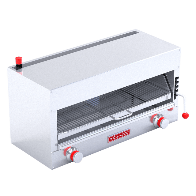 Salamandra 2 quemadores infra-rojos de 17,600 BTU/h cada uno. Para dos platillos de 25 cm. 1 Palanca para ajuste en 5 posiciones, parrilla deslizable de alambrÓn niquelado. 2 pilotos individuales, 2 válvula de ajuste flama piloto, charola de captación de derrames. Kit de espreas para conversión de gas GLP a GN.