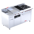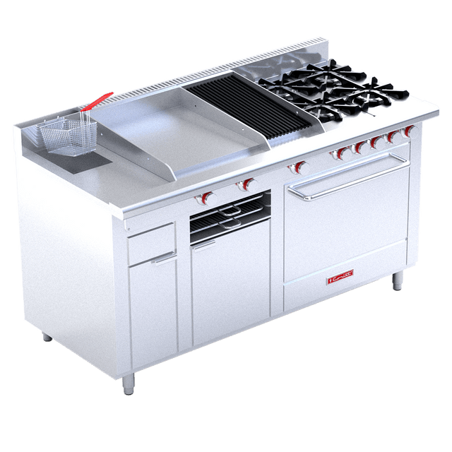 Estufa múltiple de 4 quemadores, plancha cold rolled steel de 0.54 m, asador de 0.29 m. freidora de 3 litros, gratinador y horno grande de 0.66x0.59x0.42 m con 2 parrillas niqueladas, termostato de válvula de seguridad con rango de temperatura de 100°C a 300°C y un quemador tubular.