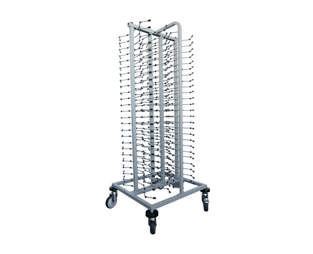 Carro porta 100 platos tipo espiguero fabricado en acero con tratamiento antioxidante y acabado epóxico de color gris. Kit 4 ruedas giratorias. Permite ajustar el diámetro de los platos hasta 33 cm. Tiene una separación de niveles de 60 mm.