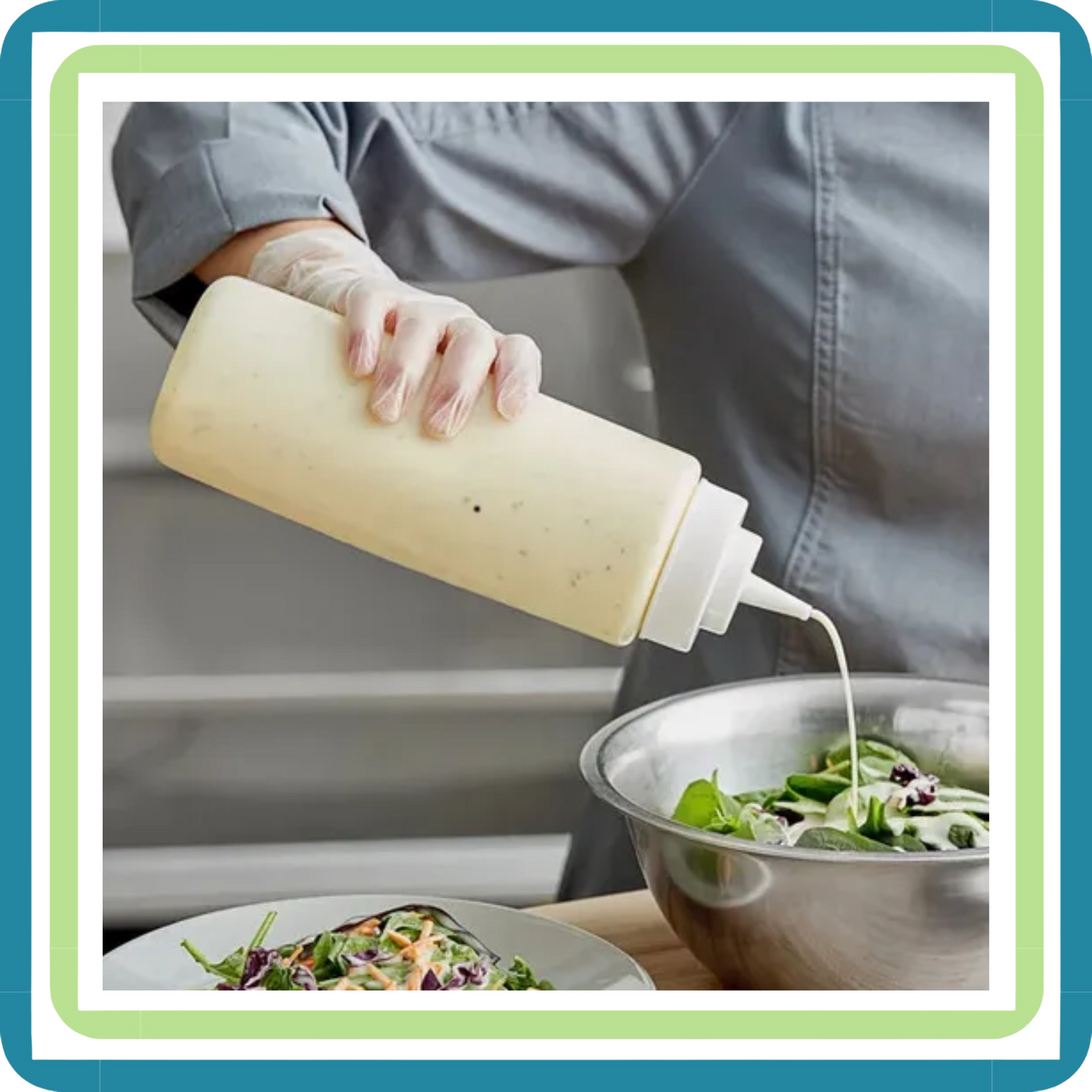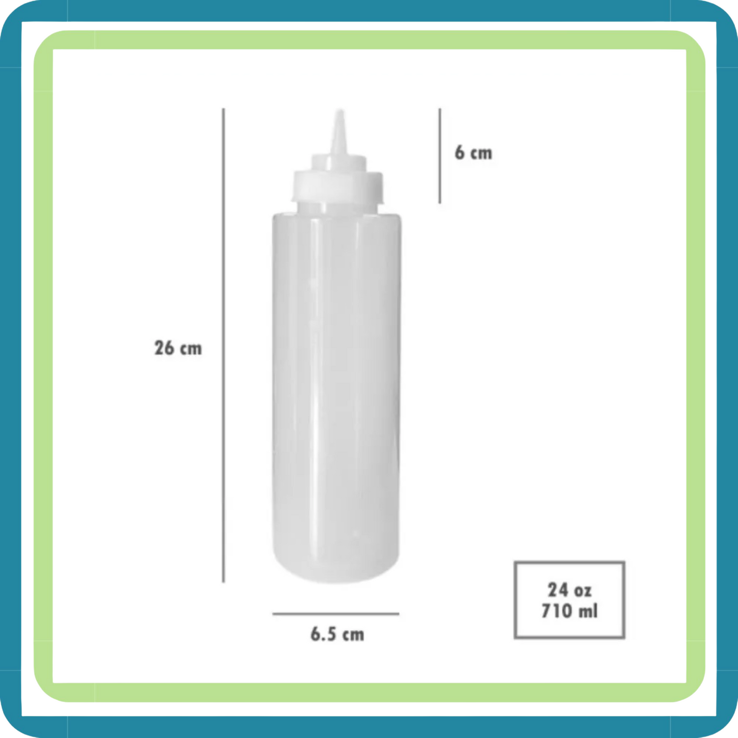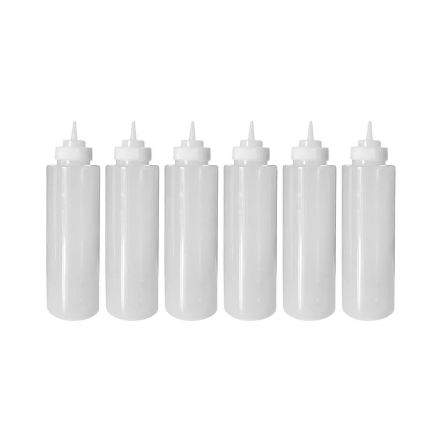 El Juego de 6 Despachadores Mamila para Aderezo de 24 oz es ideal para cocinas profesionales, negocios de comida o el hogar. Cada botella está fabricada en material plástico resistente y traslúcido, lo que permite ver fácilmente el contenido. Su diseño tipo mamila ofrece un vertido preciso y controlado, perfecto para salsas, aderezos, aceites o jarabes.
